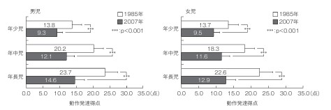 そして、2007年の年長児の動作発達得点が、1985年の年少児とほぼ同じ水準だったのです。この差はp<0.001と統計的にも非常に強い有意差であり、男児でも女児でも同様のパターンが確認されています。