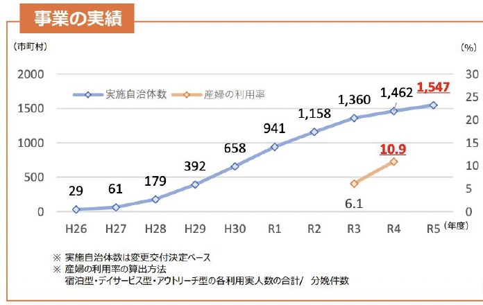 2019年に母子保健法の改正で、産後ケア事業は市町村の努力義務となりました。現在は多くの市町村で産後ケア事業が展開されており、2024年度末には全国展開を目指す方針として打ち出されました。