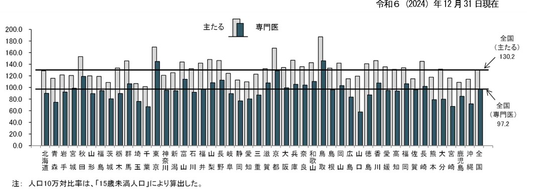 下のグラフを見てください。厚労省「医師・歯科医師・薬剤師統計(2024年)」の統計表には、15歳未満人口10万人あたりの「主たる診療科が小児科の医師数」が都道府県別に載っています(#1)