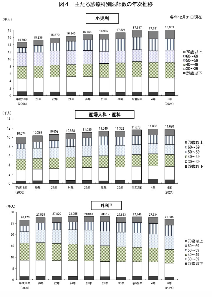 下のグラフは厚生労働省が毎年発表している「医師・歯科医師・薬剤師統計の概況」の最新版(#1)ですが、小児科医の数は過去最高の18,009人で本当に毎年着実に増えている事がわかります。産婦人科も増えていますが小児科医の方が1.6倍多いですし、外科に至っては高齢化社会にも関わらず直近5年間で顕著に減少傾向です。