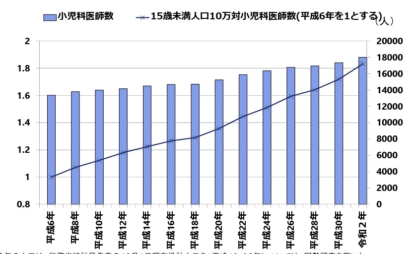 これを見ると、15歳未満人口あたりの小児科医数は近年一貫して増加し、平成6年を1とすると令和2年には約2倍になっています。当然、これは小児科医が増えただけではなく、少子化がそれだけ進んでいるので分母が小さくなったためとも言えるので、小児科医が増えたという事を示すには用いられなくなっています(少子化の進行が激しすぎるため)