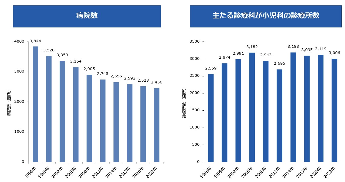 一方で小児科のクリニック(診療所)はその定義では細かく変わりますが、1996年では2,559施設に対して、2000年代~2010年代にかけて増減しつつ2023年には3,006施設となっています。