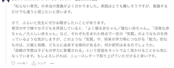 育児の中で様々な子どもを拝見していると、「よく寝る赤ちゃん/寝ない赤ちゃん」、「活発な赤ちゃん/大人しい赤ちゃん」など、それぞれ生まれた時点で一定の「気質」のようなものを持っているような気がしますが、このような「気質」や、将来の学力等につながる「能力」的なものは、父親と母親、どちらに由来する傾向があるか、何か研究はあるのでしょうか。「母親の学歴は子どもの学力に影響される」という言説をネットでよく見かけることから気になっています。もしよろしければ、ニュースレターで取り上げていただけると幸いです。